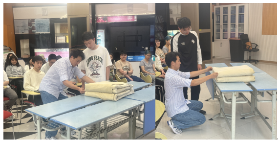 活动伊始,退伍员工代表杨斌向同学们讲述自己在部队时期的内务标准,并强调宿舍作为同学们学习和生活的重要场所需要每一位宿舍成员共同整理维护。紧接着对叠被子的详细步骤和基本要领进行细致讲解和展示,通过抖、量、压、切、塞、抹、整等一系列动作完美实现“棉被”到“豆腐块”转变,活动现场掌声热烈,同学们跃跃欲试进行现场动手实践。