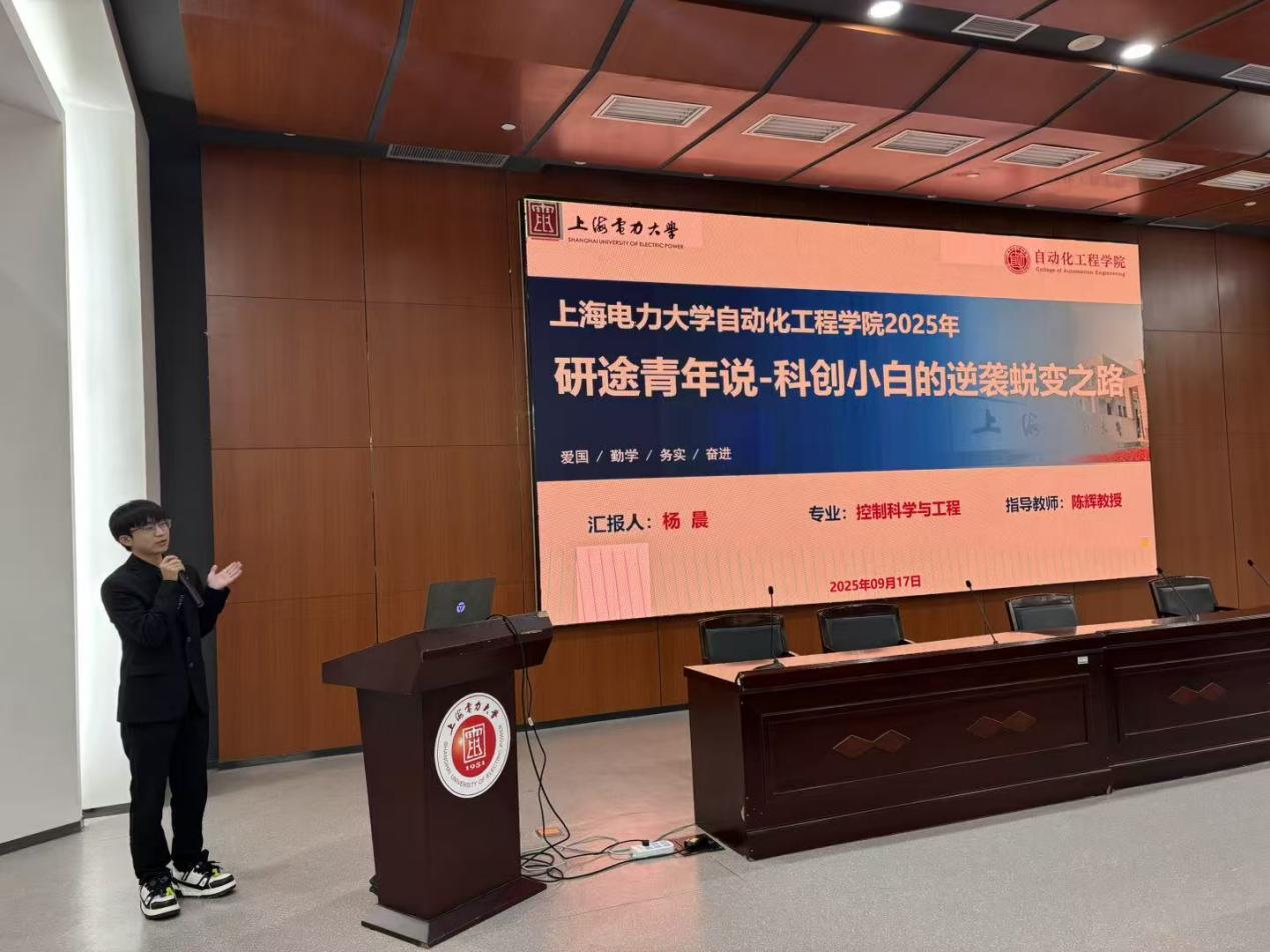 第二位主讲人,杨晨以“科创小白的逆袭之路”为题,讲述了从“兴趣入门”到“成果落地”的成长历程。他分享了自己的科创启蒙:从拆解特斯拉电路系统、操作无人机控制系统起步,在公司实验室逐步培养科研兴趣,最终成长为多项科创竞赛获奖者与专利申请人。在谈及收获时,他不仅提及荣誉成果,更强调科创对综合能力的锤炼——在电力自动化相关项目开发中实现技术突破,在团队协作中提升沟通效率,在成果转化中强化实践能力,为在场学子提供了可复制的成长范本。他还强调,要正视科研中的挫折,将其视为优化方案的契机,同时建议建立每周进度复盘机制,及时与导师沟通研究进展,在团队协作中汲取经验、少走弯路。