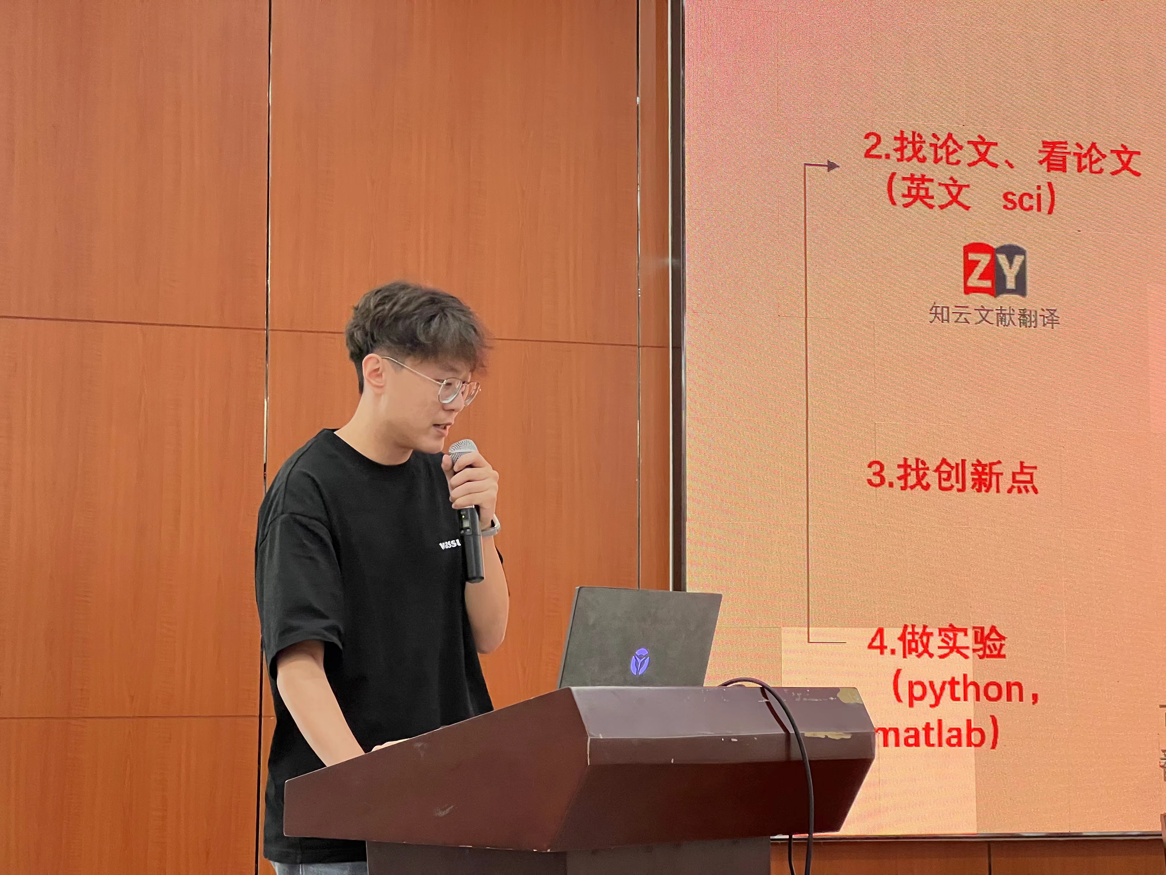 第一位主讲人,李毅凡以“科研论文全流程实战指南”为核心展开讲解,他将科研路径拆解为“领域确定—文献研读—创新点挖掘—方案设计—实验开展—论文撰写—投稿返修—录用”八大关键步骤。针对创新点突破难题,他提出融合策略——既可深耕本领域进行方法整合,也可跨学科迁移技术突破局限,特别建议结合公司电力自动化特色寻找研究切口。另外,他还分享了实用科研工具:知云文献翻译、GPT、Origin、Visio等,并强调工具只是辅助,核心在于培养独立思考能力,建议新生根据研究需求合理选择,避免过度依赖技术手段。