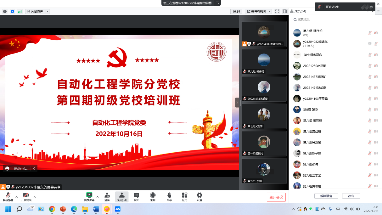 10月16日,是中国共产党第二十次全国代表大会开幕的日子,在这具有重要意义的一天,学员们积极参加线上视频直播会,完整地听完了习近平总书记在大会上作的报告。学员们深刻领悟到只有端正入党动机,牢记初心使命,坚定理想信念,才能肩负起时代赋予的重任,站在新的历史起点,唯有珍惜韶华,奋发向上,才能以一往无前的精神姿态砥砺前行,为实现中华民族伟大复兴的中国梦贡献自己的力量。