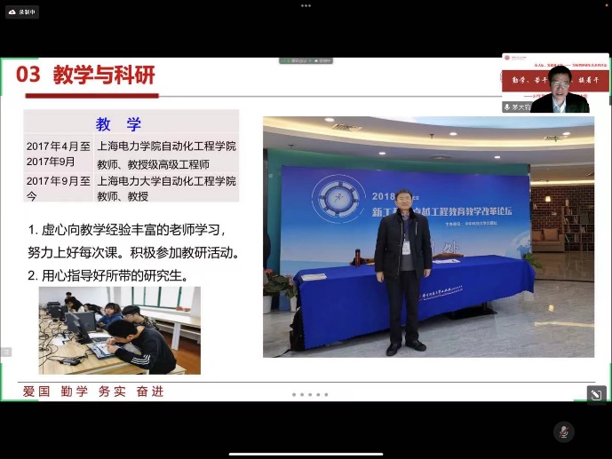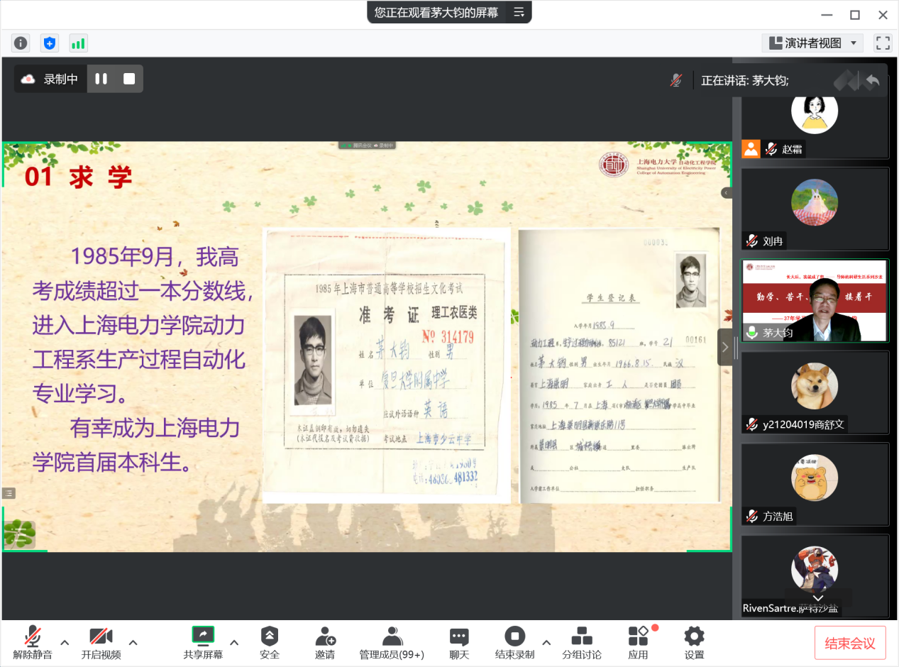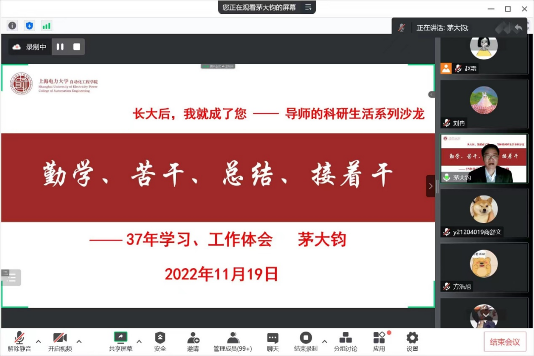 本次沙龙茅大钧教授以自身的求学科研和工作生活为切入点,分享了个人的求学、工作、教学与科研等方面重要的人生经历,结合疫情当下在校研究生科研生活的困惑,以导师的视角,结合自身的经验帮助同学们进一步清晰学习目标。首先茅大钧教授介绍了个人员工时代的求员工涯,作为我们公司的第一届本科毕业生,亦师亦友,结合公司的发展历史,带我们回顾了求学之路上重要的时间节点,展示了老一辈电力人在母校的学习经历和工作中的奋斗历程。强调在校学习阶段要重视多学科全面学习,学会与身边同学合作开展科研工作,培养多维能力。随后,茅大钧教授从个人工作、科研经历展开分享,一张张照片、荣誉和证书,都展示了一位科研工作者为国家电力事业发展做出的贡献,让同学们认识到培养科研责任的重要性,鼓励同学们以担当投身科研创新,成长为更好的自己。
