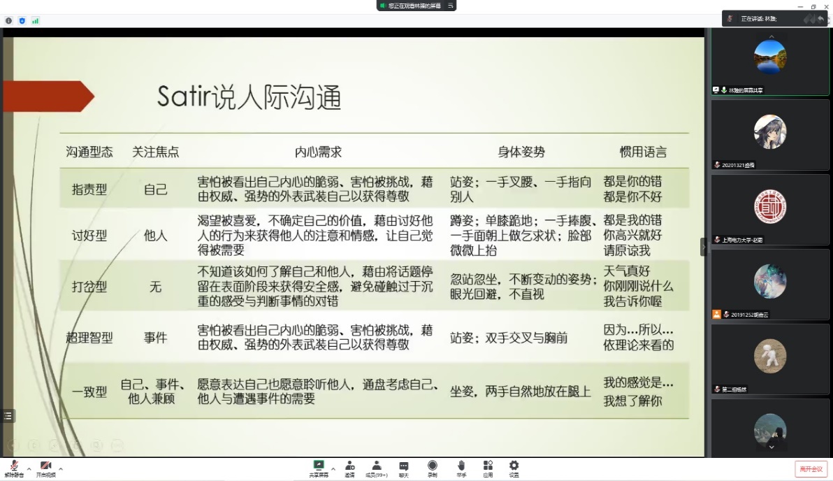 第二部分,林臻老师用一组简短对话、一个视频短片,再次强调了构建和谐的人际关系对健康成长的重要意义,指出在多种多样的人际关系中,最核心且需要我们注意的是与自己的关系,深入浅出的分析了人际互动中可能会产生的误区。用“stress”和“step”两个具有代表意义的词汇,引出人际关系的重要影响和人际交往的过程,介绍了Satir五种类型的人际关系,分析了五种不同的人际关系的实际生活具体表现。