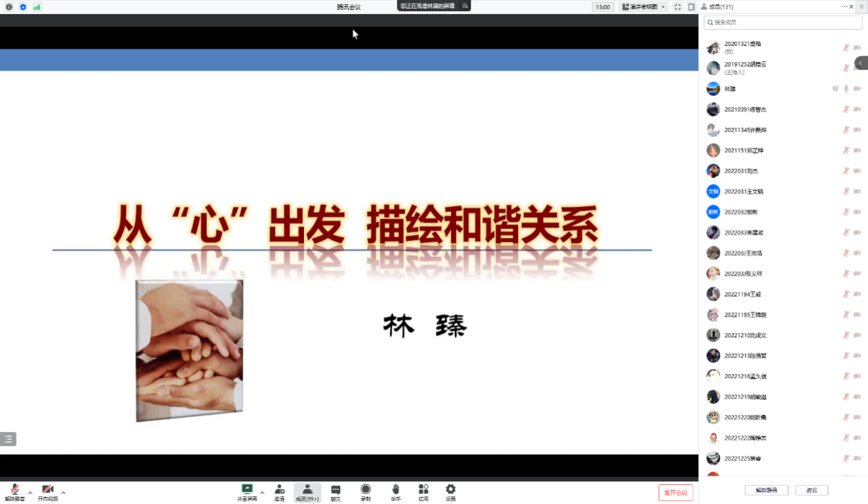 本次讲座的开始,林臻老师以心理学的视角导入,介绍了心理学的发展和意义,让同学们认识到今天的心理学已经与我们息息相关,进而引出今天讲座的主题:人际关系。林臻老师提到,我们与自己、亲人、朋友、伴侣等等一系列关系是作为人与社会链接的必要组成,并用双人舞来比喻关系的建立,同时结合当下热词以及同学们的常见问题,全面进行了解读。