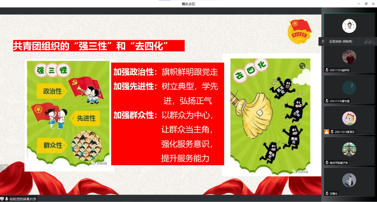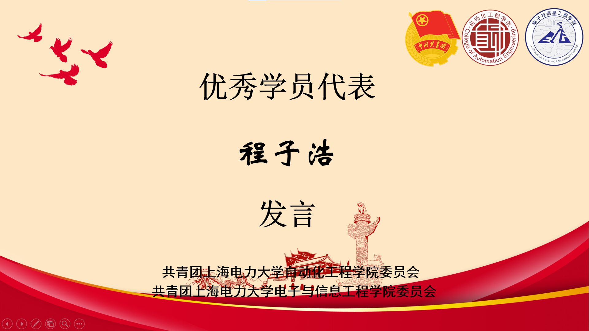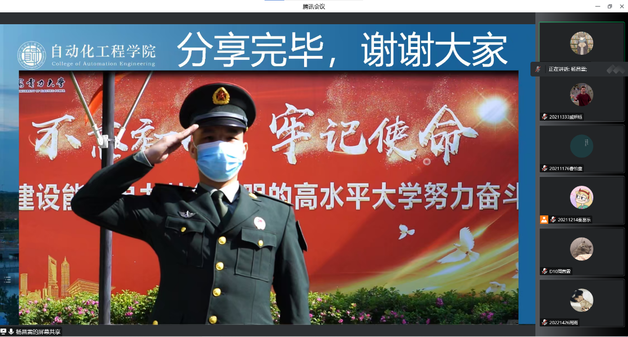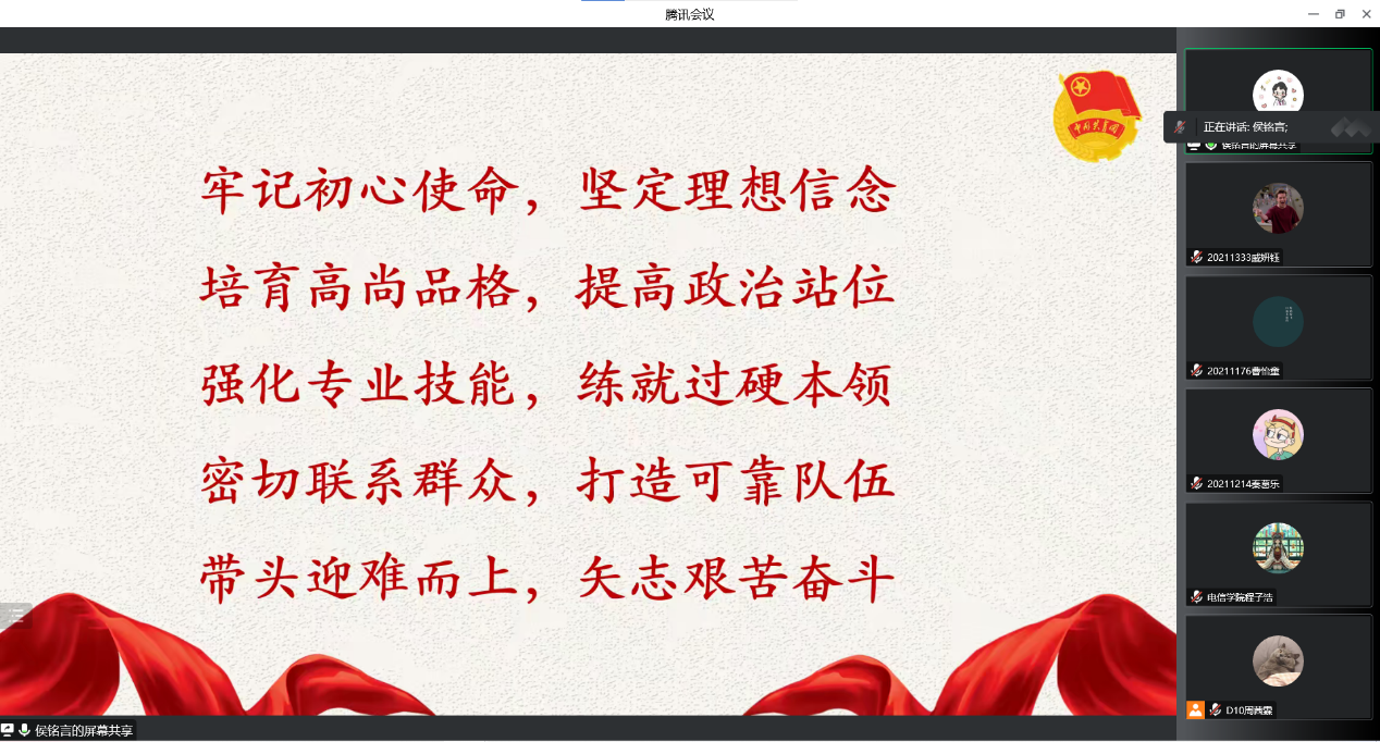 在侯铭言学长的发言中,他再次强调我们应时刻牢记初心使命,坚定理想信念、培育高尚品格,提高政治站位、不断强化专业技能,练就过硬本领。积极向党团组织靠拢,密切联系群众,打造可靠队伍、带头迎难而上,矢志艰苦奋斗。