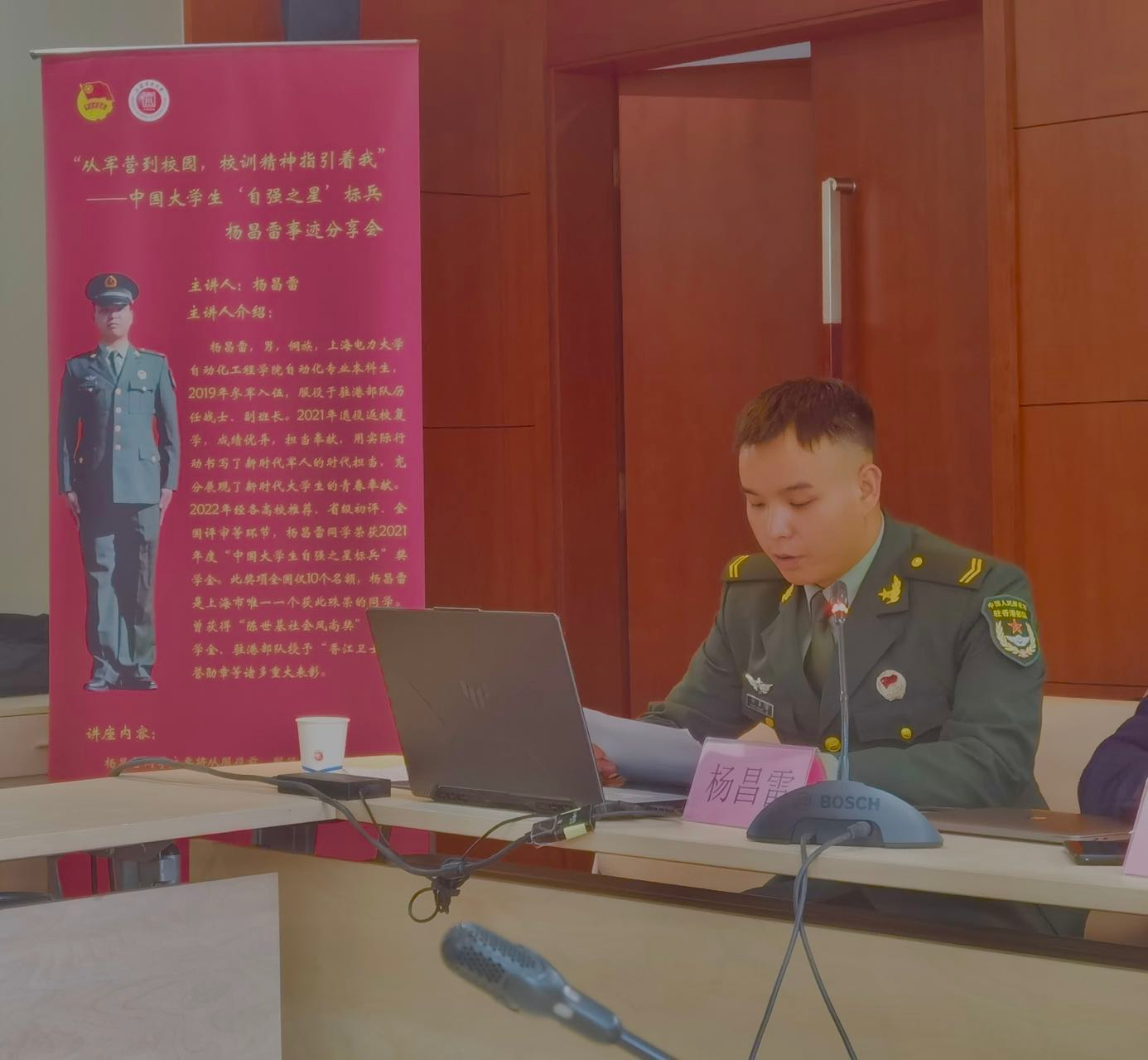 随后,杨昌雷同志为我们分享他的事迹。他说从小就有一个军人梦,至今仍记得初中时‘偷穿’过大姐军装时的激动心情,也记得入伍体检那天清晨的第一缕阳光,更记得确定入伍时的狂喜之情。这一路走来,有最初那个军人梦的力量支撑着他,也有内心不断呼唤的声音激励着他,一步一步向军营靠近。2017年进入大学后,在校期间他加入校国旗护卫队,用刻苦训练的汗水护卫国旗,弘扬爱国主义精神。因训练扎实、军事技能过硬先后受聘担任2018级、2022级新生的员工军训教官。最终,2019年9月成功参军入伍,服役于中国人民解放军驻香港部队。在香江之畔,他是维护“一国两制”的香江卫士。驻香港部队授予他“新时期大渡河连十七勇士奖章”。2021年9月份退役复学,校园生活中军人的优良作风并没有退役。