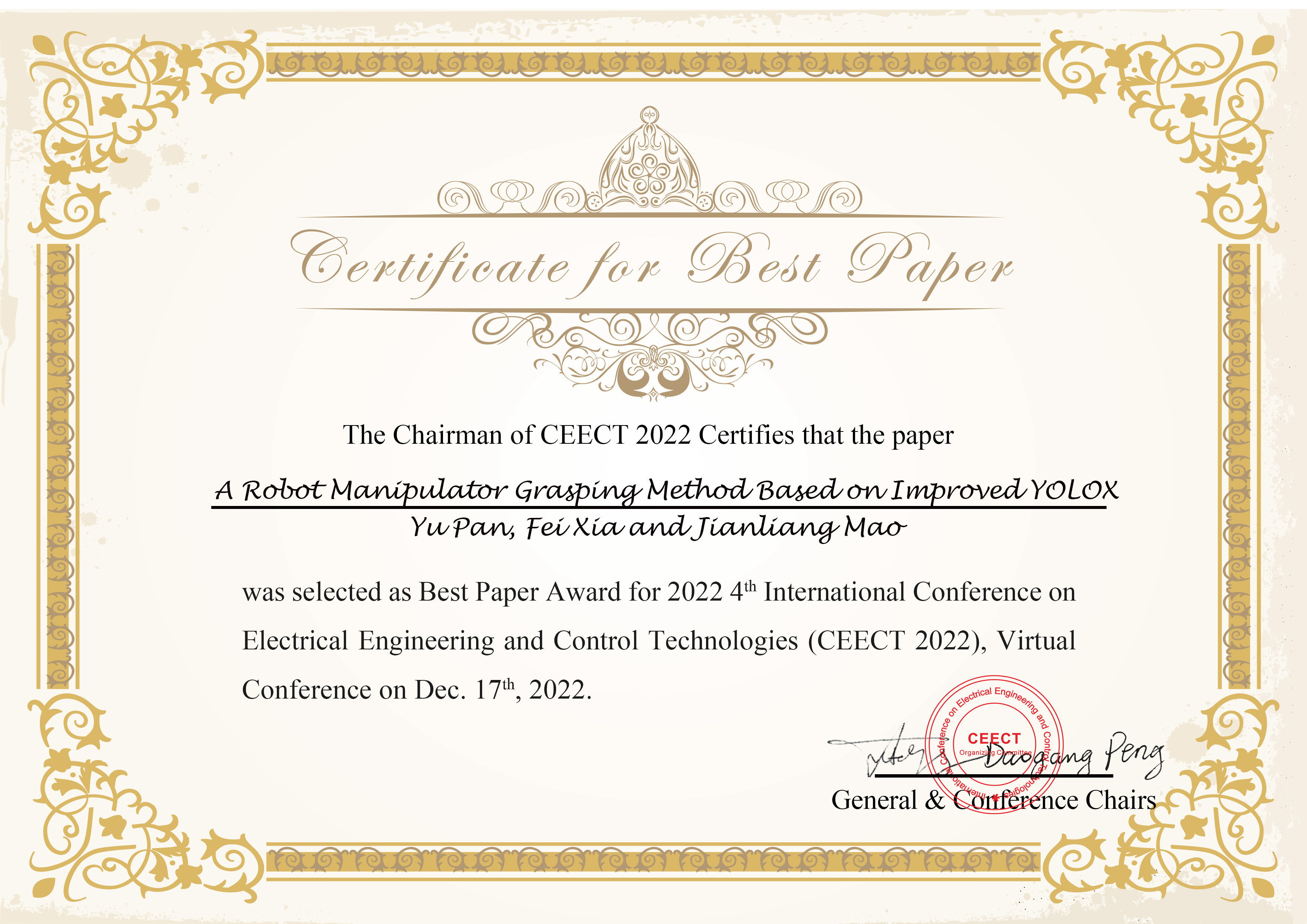 2022年12月17日,由304永利集团、亚太科学与工程研究所(APISE)共同主办,IEEE Control Systems Society、江苏大学和奥克兰理工大学协办的2022年第四届电气工程与控制技术国际会议(CEECT 2022)成功在线上召开,在线人数400余人。