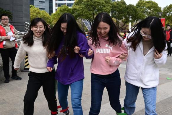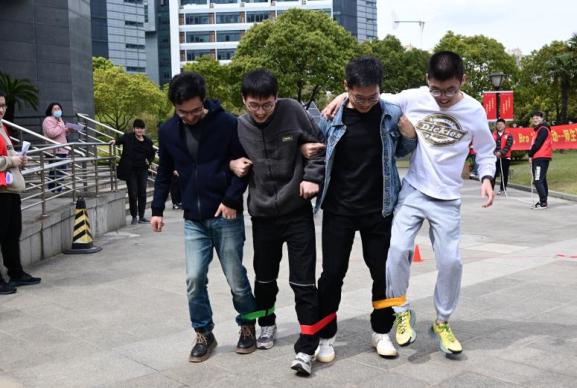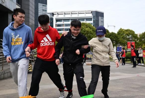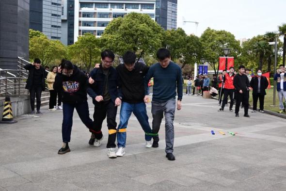 最后同舟共济--三人两足比赛,则需要师生四人在将腿脚绑在一起的情况下,一起合作,步调一致,心连心,共同朝着目标奔去。欢快的加油助威声浪带火了比赛。