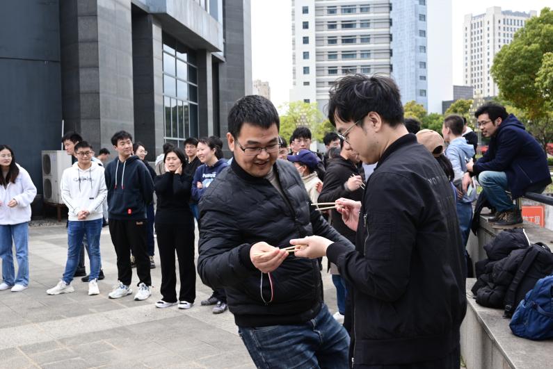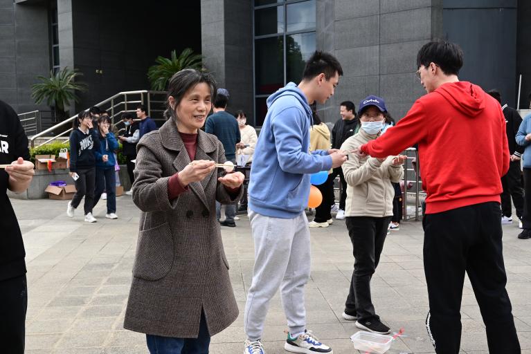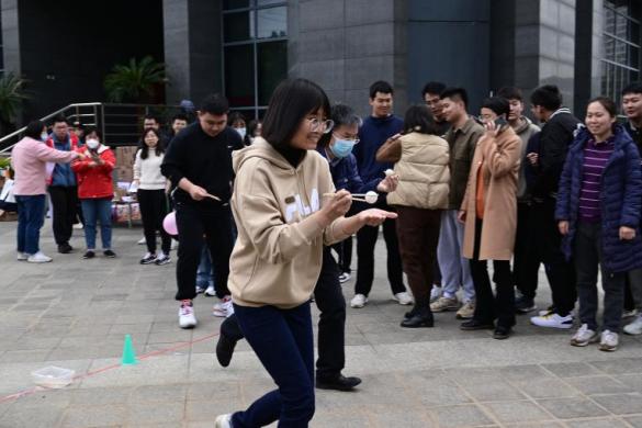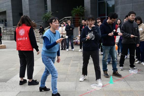 首个项目“乒乒乓乓”--筷子传乒乓球,考验了选手们的耐心和策略,参赛者需要在最短的时间内完成乒乓球的接力传递,比赛过程中选手需要找准最佳夹球位置的同时保证用力适中。不掉球,需要技巧和方法,也需要耐心和镇静。在师生们的一声声加油,揭开了趣味运动会的序幕。
