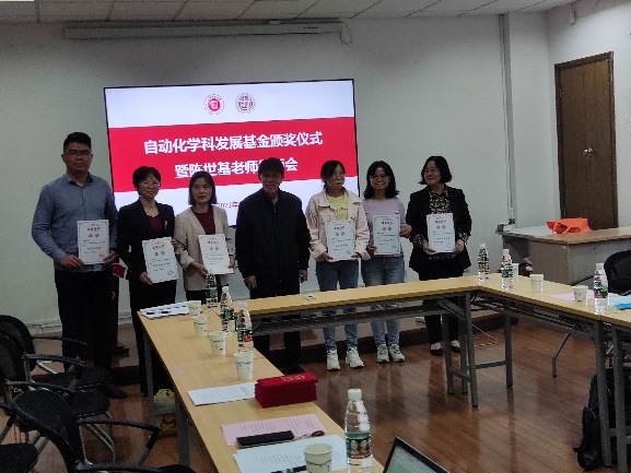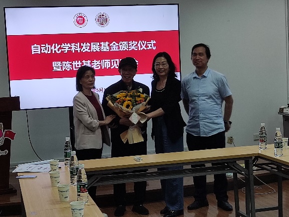 陈世基教授为获奖的青年教师和员工代表颁发证书,以示对他们优异成绩和努力付出的鼓励和支持。青年教师代表和员工代表们纷纷发言,衷心感谢陈世基教授及其他员工的悉心教诲,感谢自动化学科发展基金带来的激励和鼓励。他们表示,将倍加珍惜这次难得的机会,继续努力学习和工作,努力成为像陈老师这样深受员工喜爱的好老师,为公司和社会做出更大的贡献。钱虹、黄伟和叶传良三位老师表示,在校期间得到过陈老师指导和帮助,陈老师严谨的治学态度和对员工的仁爱之心,对他们都有很深刻的印象与影响,让他们在教师的职业道路上受益匪浅,他们向陈老师献上了鲜花,以示敬意与感谢。