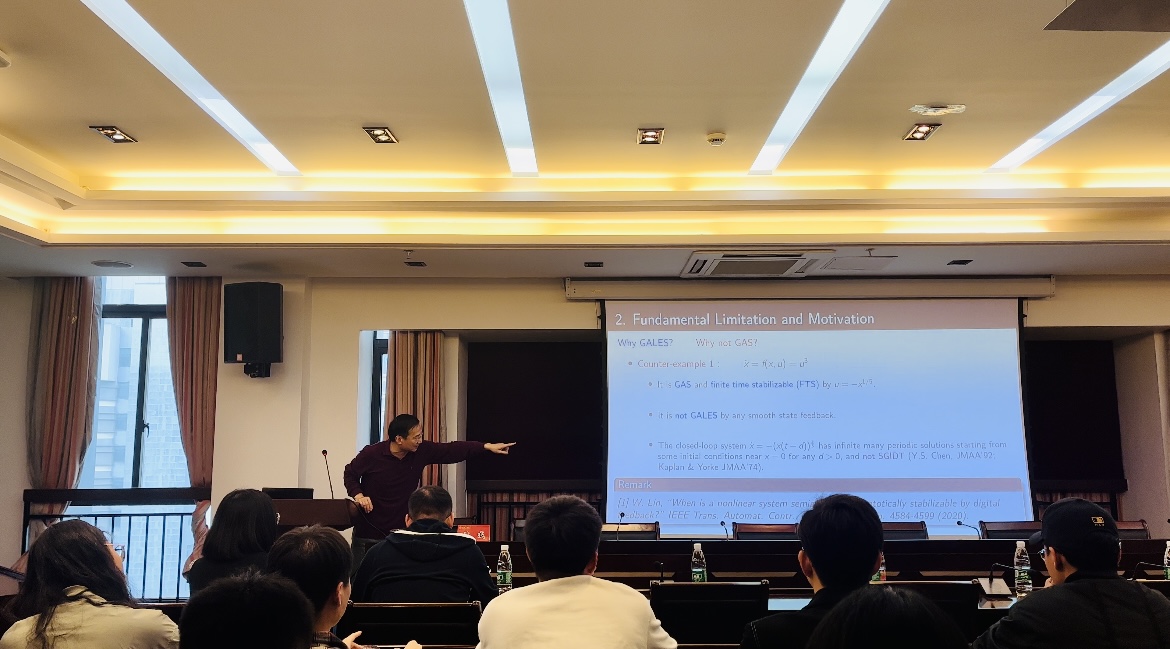 林威教授主要分享了团队在非线性控制系统研究中时滞输入容限问题的最新研究进展。考虑到参会员工的不同专业基础,林教授从全局框架出发,通过“多形式、多角度”的描述,结合简单易懂的控制模型,清晰阐述了时滞容限问题本身的含义,并介绍了在电力机器人领域中的研究意义。此外,针对光滑状态反馈和输出反馈下的半全局时滞容限问题,林教授清楚展示了问题研究的全过程,以及过程当中遇到的问题和解决方法,并给出了最后的研究结论和直观可视化的仿真结果。林教授采用清楚明了的演讲方式,将复杂的研究内容传达给参会听众,不仅提高了在座师生的专业知识水平,还促进了各学科之间的交流合作,为同学们未来科研路上解决相关控制问题提供了新的思路。