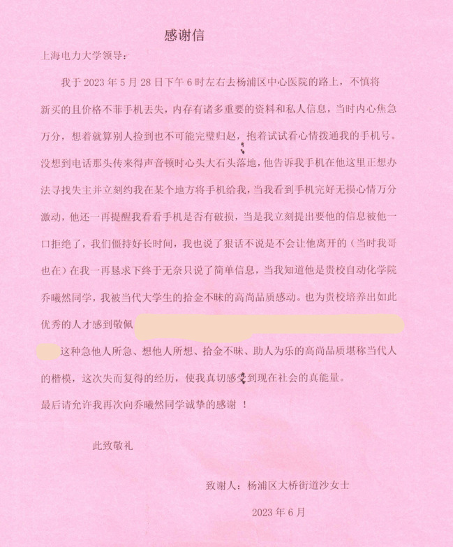 6月9日,304永利集团收到了一封感谢信,来感谢本院2020级自动化专业乔曦然同学拾金不昧事迹。