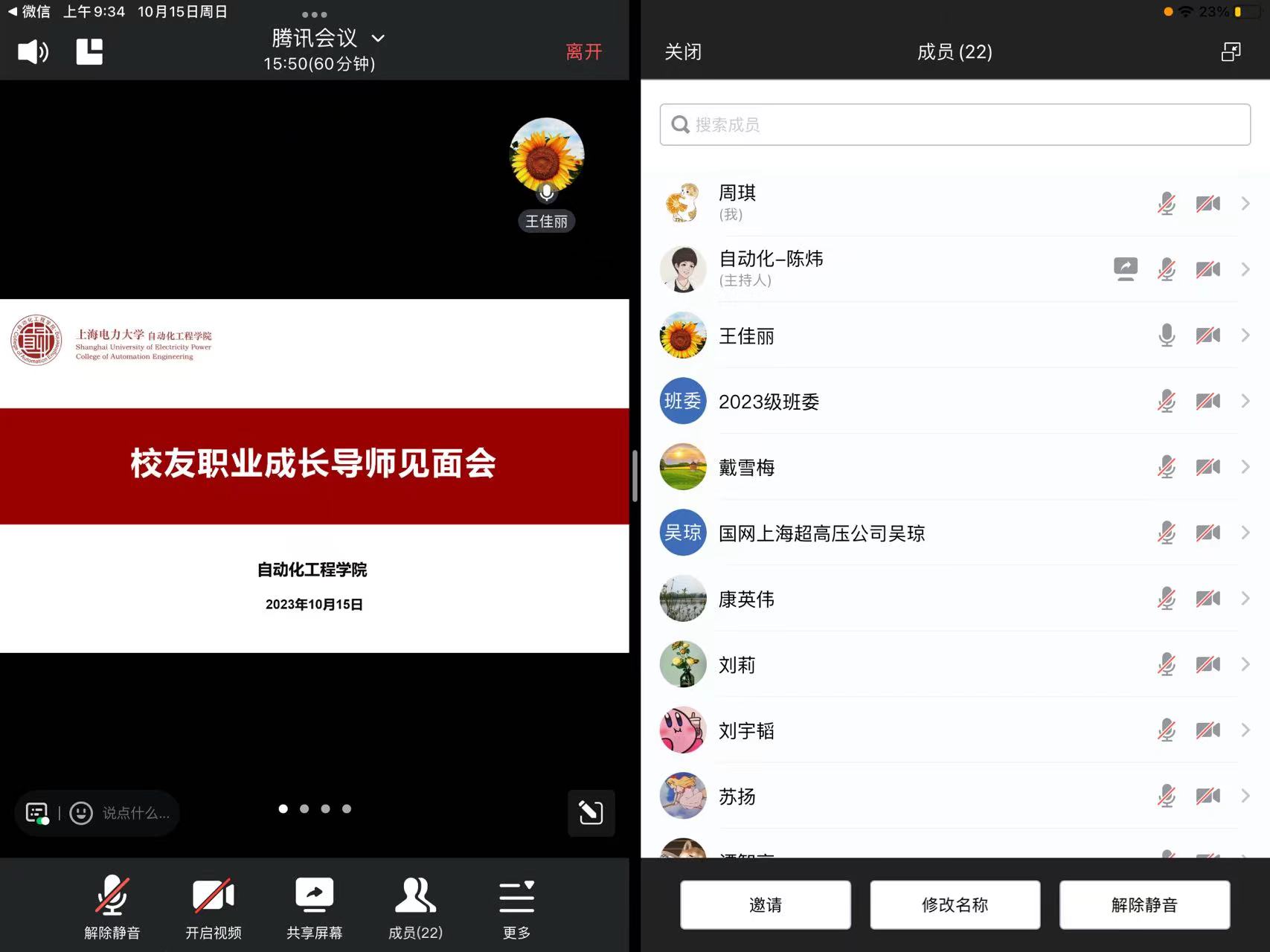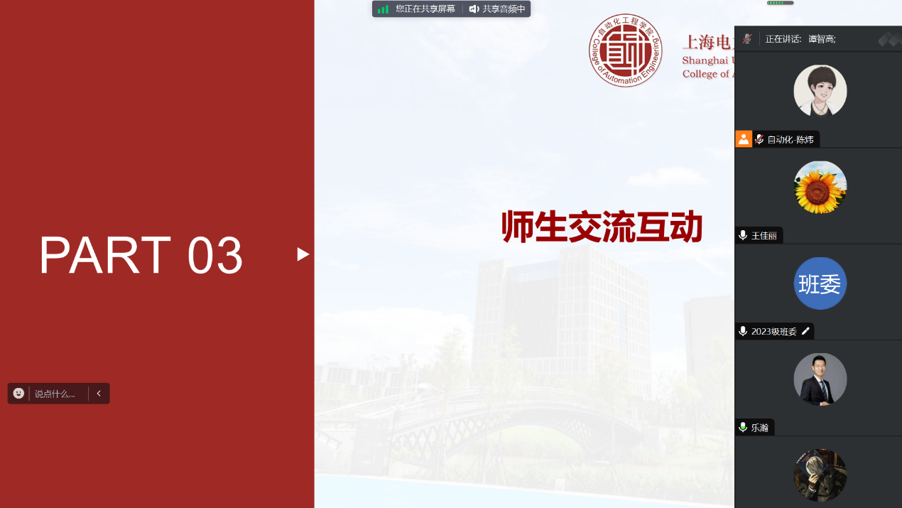 在经验分享环节,各位员工导师们纷纷表示往日校园里学习生活的场景还历历在目,转眼就以毕业多年,很荣幸能够被聘任为2023级本科生的员工职业成长导师,祝福公司、公司发展越来越好。员工们结合自己的工作经验和23级同学们分享了很多故事,劝诫同学们要珍惜大学时光努力学习科学知识,把握青春的美好勇敢追求自己的目标,坚定理想信念为中国式现代化贡献力量。更是从工作中的实际情况出发,表示企业和用人单位对于上电学子的认可,鼓励同学们坚定信心做好生涯规划,相信同学们未来的求职就业和职业发展的路上会大有可为。同时,他们表示期待和同学们在班级中见面,做更深入的互动交流。最后,23级员工代表与员工导师关于生涯规划和就业形势等问题展开讨论。