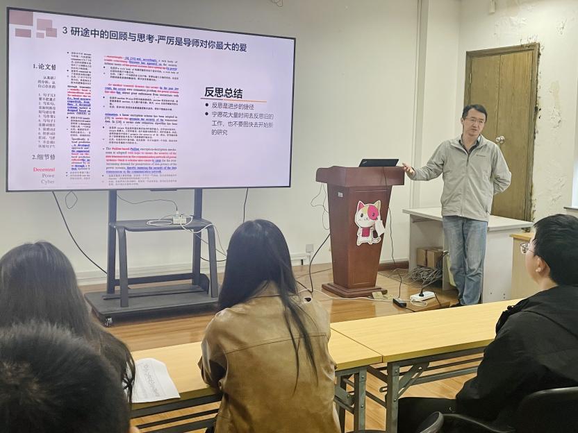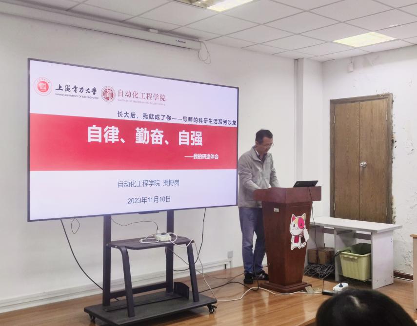 本次主题沙龙,渠老师从自我介绍、个人成长经历、研途中的回顾与思考三个方面来展开。首先渠老师强调了树立良好的学术态度的重要性,在结合自己的大学经历说到,学习过程中会伴随着苦与乐,要学会与身边同学合作开展科研工作。鼓励同学们积极参加科创类比赛,在实践中不断提高自我,成为一名创新性人才。而后分享自己在读博初期研究方向从工程实践到理论研究的痛苦转变,当时的每一天都在失眠中煎熬,每一天都在自律中坚持。不经历风雨如何见彩虹,也让我们看到学术研究其实是个苦中作乐的过程。