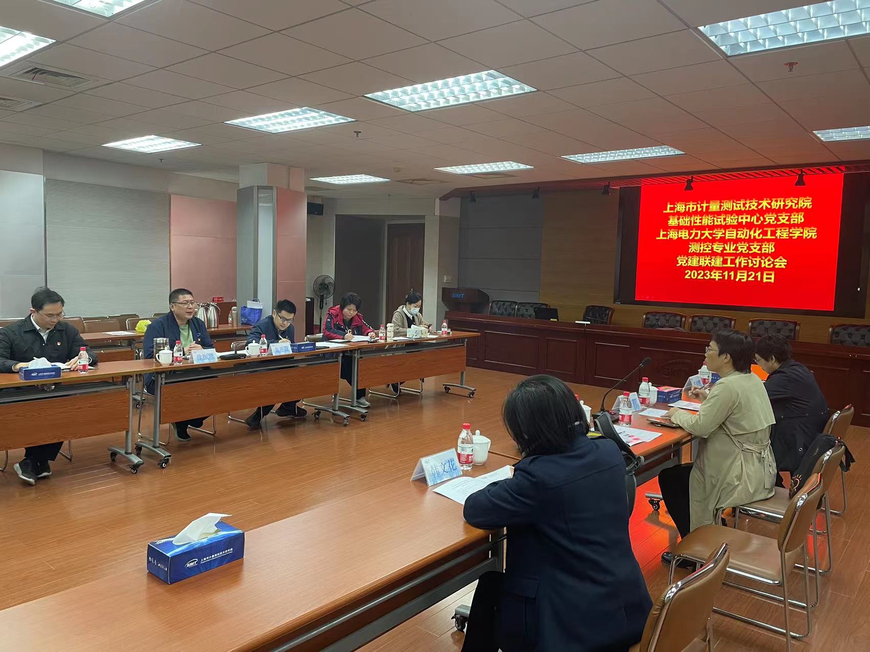 上海市计量测试技术研究院副经理徐振兴、基础性能试验中心主任兼党支部书记金善益对刘莉一行表示热烈欢迎,并介绍了研究院和基础性能试验中心党支部的基本情况,刘莉表达了感谢并介绍了公司、公司和测控教工党支部的基本情况。随后双方围绕人才培养、实习实践、科研合作等进行了深入交流,希望通过开展党组织共建,引领和推动双方的交流与合作,实现“资源共享、优势互补”。双方支部表示,未来将以支部共建为契机,加强校企交流与合作,多措并举推进党建与业务工作“双融合”“双促进”。