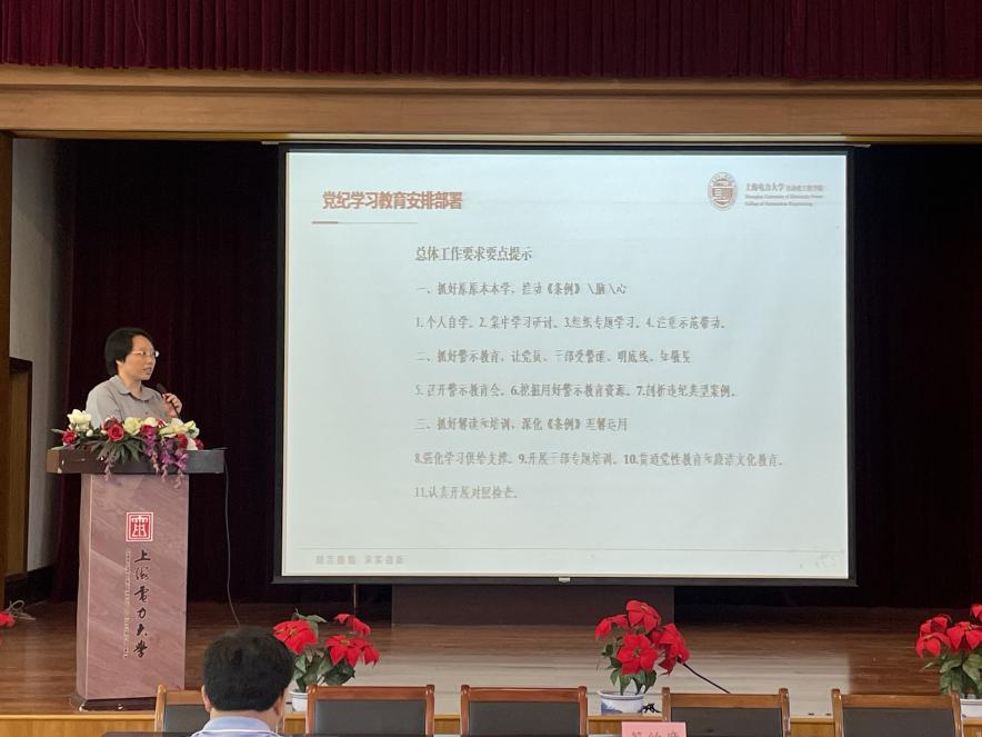 会上,公司党委书记刘莉对公司党委党纪学习教育进行安排部署,她分别从“公司党委、党支部和党员”三个层面提出党纪学习教育工作要求。她强调了个人自学、集中学习研讨、组织专题学习的重要性,要求全体教师党员坚持原原本本学、坚持条例入脑入心。并现场带领与会教师观看《零容忍》警示教育片。