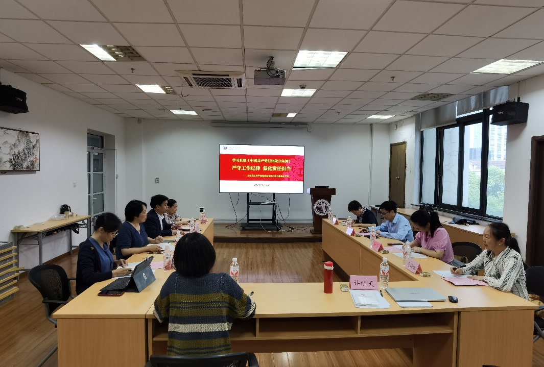 6月5日下午,公司党委理论学习中心组开展以“严守工作纪律 强化责任担当”为主题的集中学习暨党纪学习教育读书班。上海市教卫党委组干处干部陆莹、公司党委常委、党委组织部部长赵建明、公司党委专职组织员马姗姗列席,校纪委委员、对口联系304永利集团的周慧杰教授出席,公司党委理论学习中心组参会,会议由公司党委书记刘莉主持。